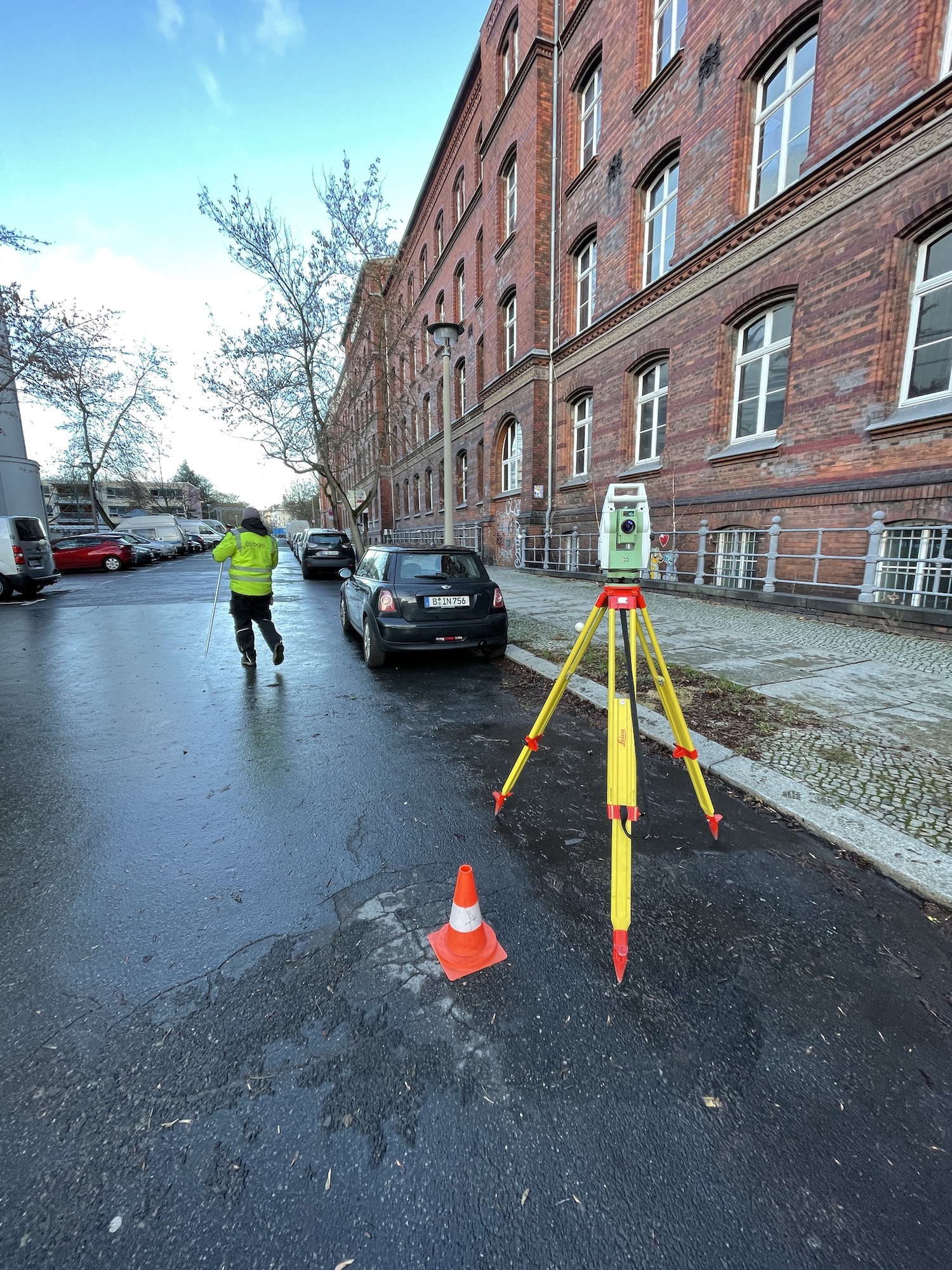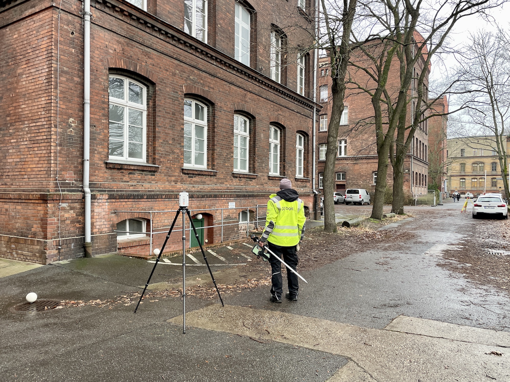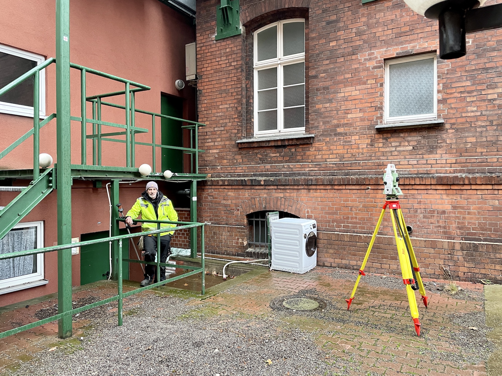 Für dieses Projekt wird für die Außenscans der Leica RTC 360 Scanner eingesetzt. Um das Gebäude im bestehenden Koordinatensystem zu bestimmen, wird standardmäßig zudem eine klassische Tachymetriemessung durchgeführt.