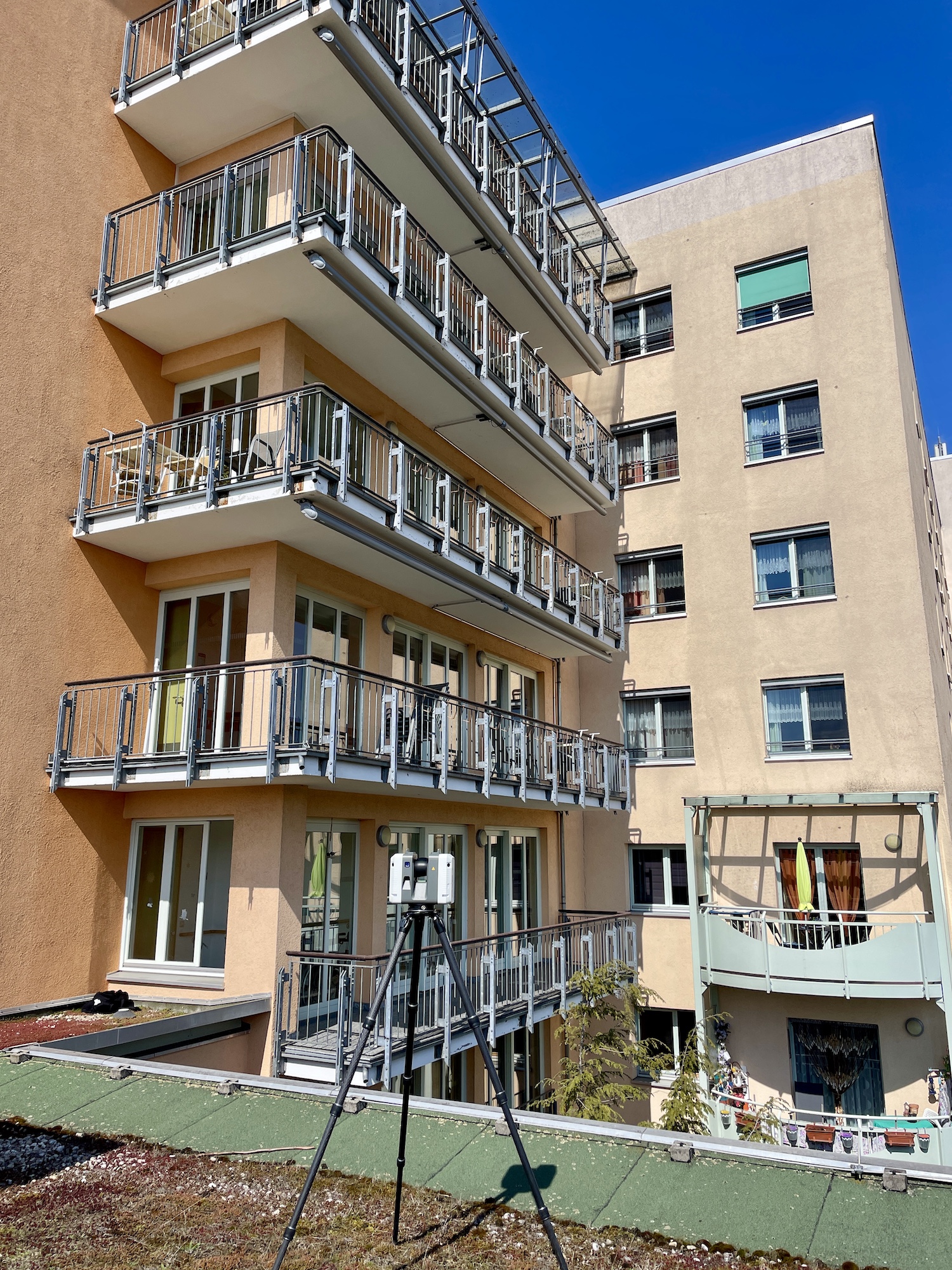 Bei diesem Projekt nutzt das Team bgis das Mobile Mapping System NavVis VLX für den Innenbereich. Die Fassade wird mit dem terrestrischen Leica RTC 360 erfasst. Standardmäßig bedarf es zudem einer klassischen Tachymetriemessung.