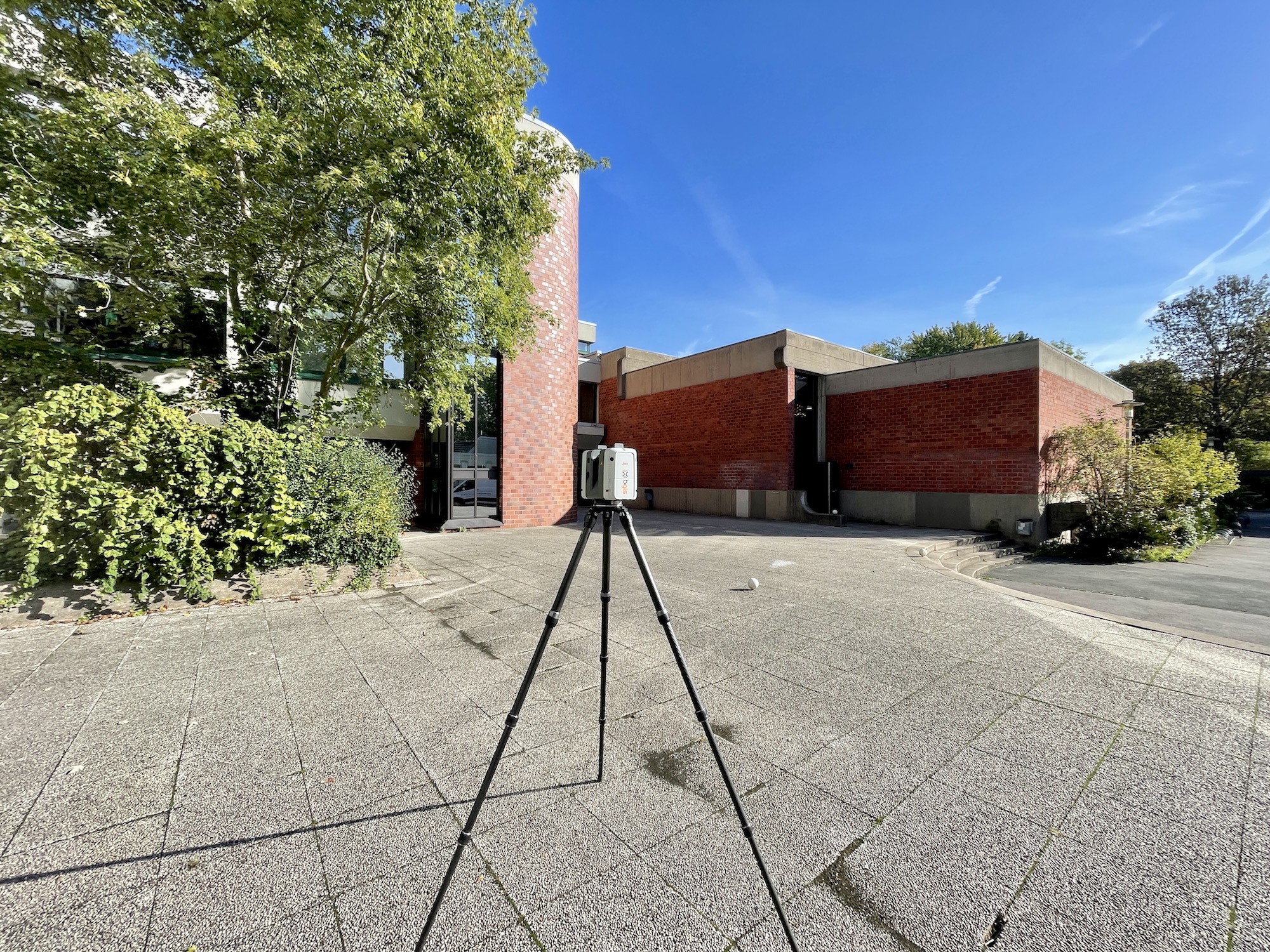 Für dieses Projekt wurden für die Außenscans der Leica RTC 360 Scanner eingesetzt. Die Räume im Gebäude wurden mit dem Mobile Mapping System NavVis VLX erfasst. Dies ermöglicht eine schnelle und präzise Erfassung der Gebäudegeometrien. Um das Gebäude im bestehenden Koordinatensystem zu bestimmen, wurde zudem eine klassische Tachymetriemessung durchgeführt.